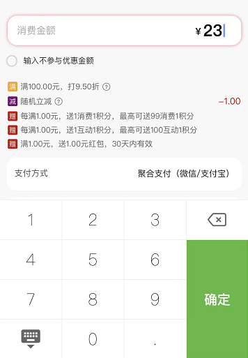 1、支持红包,优惠券,积分抵扣,余额消费等2、支持优惠活动设置,如满减,消费送积分,打折等3、支持多用户商铺收款4、支持使用聚合支付收款,费率更低