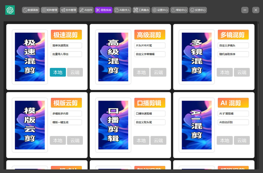 本软件包含了市面上热门的创作工具,如: AI文生图、老照片修复、数字人、动漫生成、换脸、变龄、UGC裂变、段视频混剪、矩阵分发等功能,具体功能请查看最新版的演示