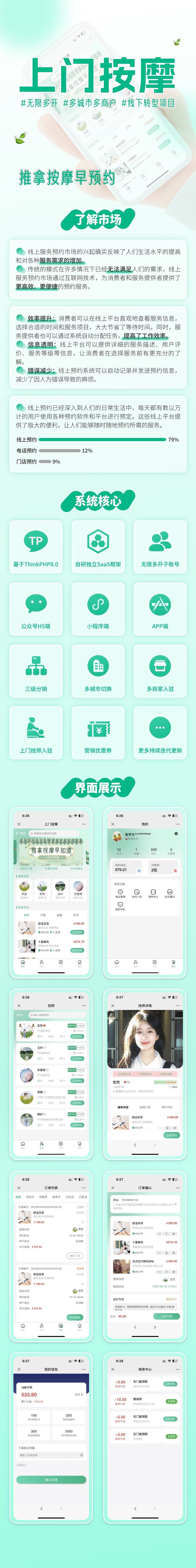 首页 >> 系统应用 >>O2O系统 >> 按摩疗理服务预约系统、线上线下同步运营(H5+小程序+公众号+APP)