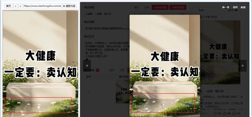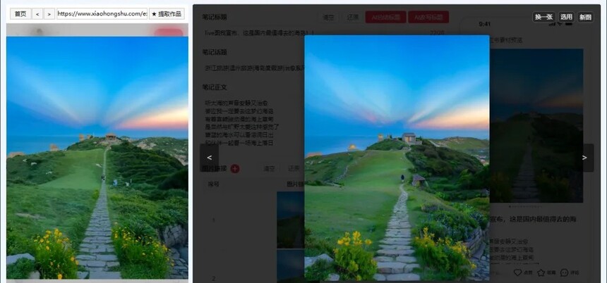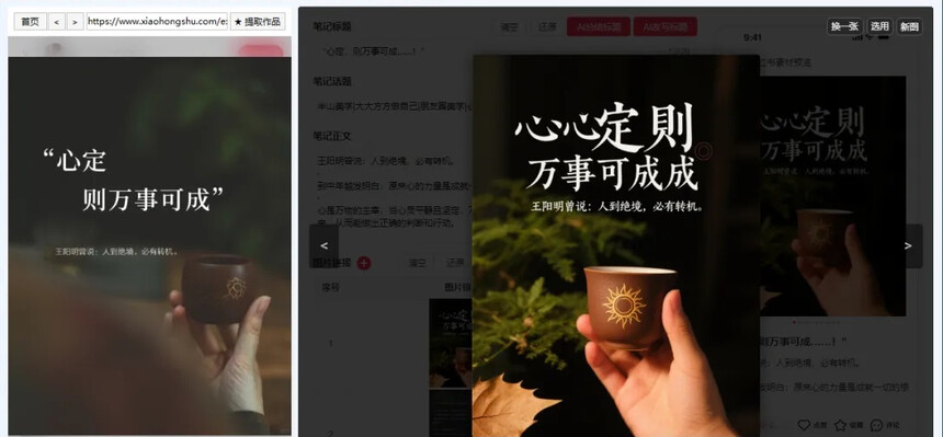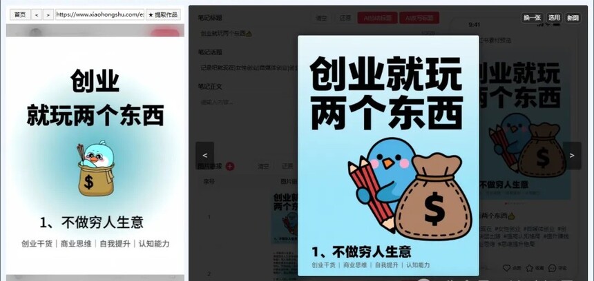 使用工具一键改写标题、文案,和市面上其他工具不一样的地方时可以用AI绘画功能处理图片,能一键AI修改、扩图、重绘、微调图片,以保证作品的100%原创并且保留爆款作品的爆款核心,无论搬运还是做原创一个工具搞定。 一、原理 1.AI暴力改写:抓取对标作品,AI一键洗炼标题、笔记正文,保留精髓剔除搬运和AI痕迹。 2.AI视觉新生:原图丢进模型(豆包/内置任选),秒出构图相似、细节迥异的“孪生图”,字体风格同步克隆!告别PS蒙版提高创作效率,原创度拉满💯。 3.真机矩阵发布:生成专属发布链接/二维码,任何手机扫码即跳小红书,真人真机发布,平台规则直接拿捏🤏。 二、优点 1.🔄 全行业血统兼容:不管你是创业粉、大健康、旅游还是虚拟资料,AI模型见招拆招,字体、构图、风格精准复刻,通杀赛道无死角。 2.⏱ 效率核爆级提升:改标题?P图片?手动发布?老黄历了!AI三件套(标题+文案+配图)流水线产出,1小时干完1周的工作。 3.🛡 100%过原创护甲:AI绘画重塑视觉基因,平台查重系统直接懵圈。左边原图右边AI图,相似却不同,原创认证轻松到手✅。 4.📱 真机矩阵0风险:链接/二维码直通小红书APP,真人设备操作天然抗封,真机矩阵、代发团队、云控系统无缝适配。 三、实操 [原作品与AI生成作品对比图],为了方便查看,已经用红圈圈起来了,对比一下您就知道了 看了上面的图,我们直接来实操,操作步骤非常简单,看一遍流程您也能操作。 1)打开工具后登录自己的红书号 2)找自己行业的对标作品 无论是带文字的作品还是不带文字的作品,都可以直接对标,这里我会多演示几种行业。 比如你是卖手镯的,可以直接搜索相关的关键词,查找爆款的作品 3)AI创作作品 然后点开一篇作品 然后点几提取作品,就会把图片、标题、文案、标签提取到中间部分。 然后开始你的改写或者创作即可。 4)生成标题 如果你想通过笔记正文总结标题,就点击AI总结标题,如果想根据原标题改写出新的标题,就点击AI改写标题,在这里我直接点击AI改写标题。 5)生成笔记正文 没有特殊要求直接点击AI改写笔记即可根据原文案生成类似的新文案。 如果有其他的要求,可以点开AI创作笔记,根据你自己喜欢的风格进行文案生成。 6)图片生成 图片生成有两种模型,一个是文心大模型,一个是豆包大模型,想要文字生成的也好看就选择豆包,不包含文字的图片或者风景画等可以直接用文心模型。 对于作品,我们还可以指定模板进行模板作图,有这功能一般用不到。 用的多的就是AI创作图片和AI处理图片。 这里可以直接点击AI处理图片,处理所有的图片,现在正在处理,还剩2张图片, 处理完成后我们来对比一下。这里我的处理是选择的豆包模型,创造力3级, 为了方便我们观察前后的效果这样进行选择,因为这样生成的图片和原图差距比较大,方便观察。 一次生成4张原创图 如果生成的效果不满意,需要单独处理某一张图片,还可以点击某一张上的AI创作进行图片处理,还可以调整位置,或者删除作品或者还原到初始状态。 在图片处理完成后,想要在多添加一张图片,让原创度更高,可以点击AI创作图片,让AI生成一些图片。这个AI生成的图片,可以自己去调整一下关键词来生成图片内容,这里仅做演示。 对于生成的图片,选择一张满意的点击使用此图就会添加到图片组中。 看到这里了,您是不是感觉这个工具很强大?如果认同强大,给我一个点赞转发在看吧。 不知不觉写了很多的内容,其实使用起来非常简单,就是一选作品,二改写,三发布,就这么简单。 7)保存素材 在处理完标题、正文、图片以后如果现在不想发布还可以点击保存素材,把自己改好的内容,保存下来, 等待下回使用的时候点击载入素材,把自己做好的内容,载入进来即可。 8)手机发布 点击手机发布,会生成一个二维码和一个链接,链接和二维码的有限期55分钟,生成后请尽快操作,以免失效。 这个发布也是非常的快捷简单,直接浏览器扫码,或者浏览器打开链接即可自动跳转到小红书,您只需要点击发布即可。 到这里,整个的技术文章就写完了,写的没有那么的精致,都是简易的操作过程,本没有那么复杂,也没必要吹嘘,你看到的就是最真实的,好了到这里技术文章就结束了, 下面来看一下工具创作的更多效果,包括图片上文字效果。 所有评价(0)
