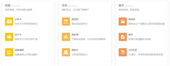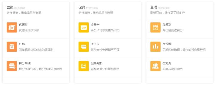 丰富多样营销工具,展示、互动、营销等数十种营销插件,20款商城营销功能、41款应用插件仍在不断更新